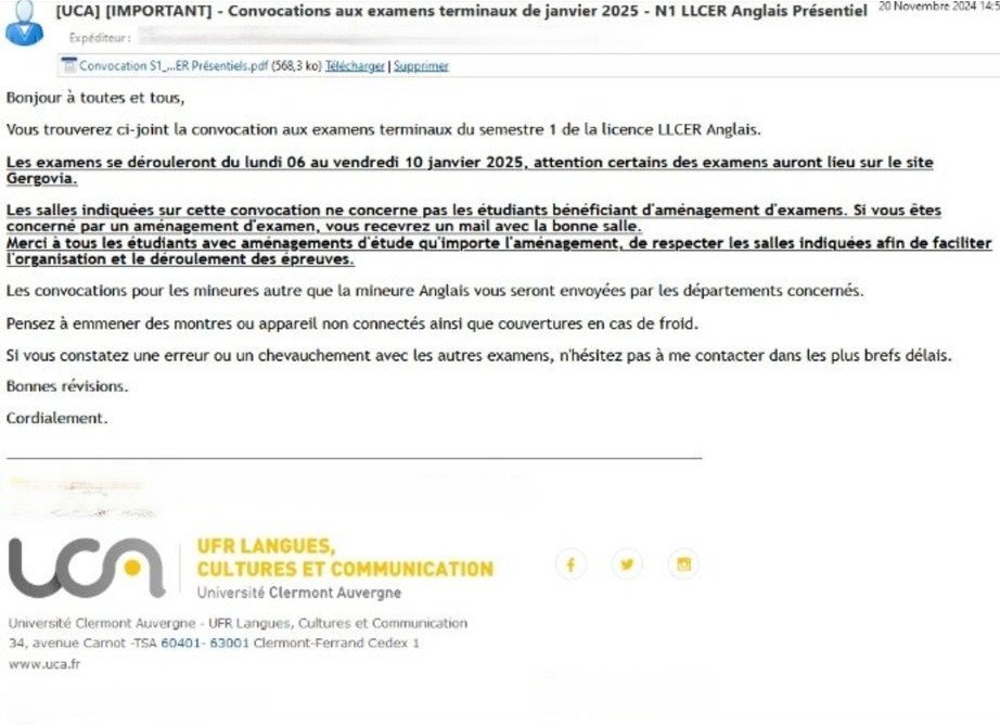 C'est un mail tout ce qui a de plus classique qui ne passe pas auprès des étudiants. À l'approche des sessions d'examen, l'Université Clermont Auvergne a envoyé les convocations aux étudiants qui passent leurs partiels en janvier 2025. Outre le fait d'emmener des montres non connectées, l'UCA suggère aux étudiants d'emmener des "couvertures en cas de froid".