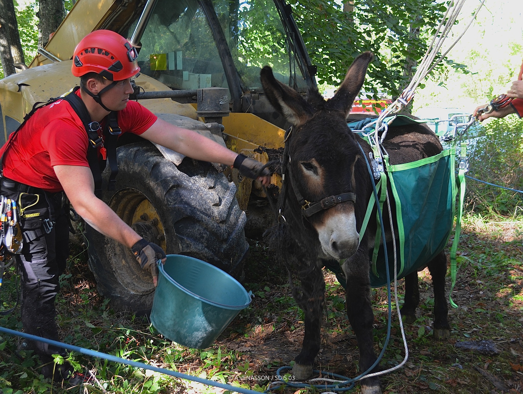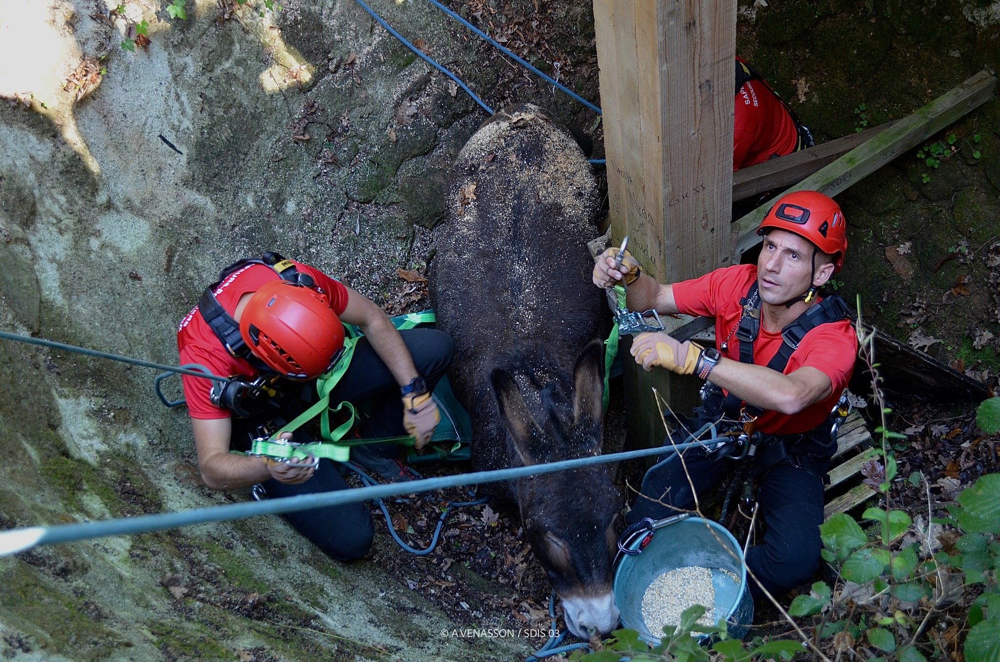 L'intervention difficile et périlleuse a duré quelques heures. L'âne a finalement été harnaché autour du ventre pour pouvoir le soulever dans les airs et le sortir de cette situation.