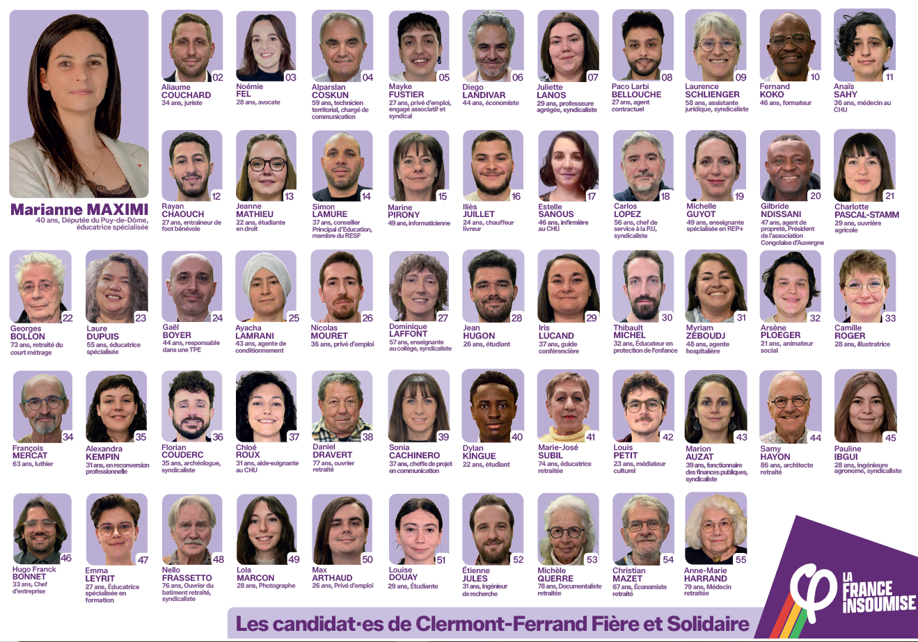 La députée veut "construire une liste d'union populaire" qui représente la diversité de Clermont-Ferrand. On peut dire que le pari est réussi sur le plan de l'écart d'âge au sein de la liste : les colistiers ont entre 21 et 86 ans. La moyenne d'âge est de 42 ans avec 17 candidats de moins de 30 ans.